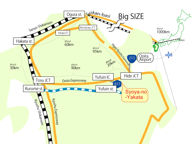 | 車とバス: | 博多から湯布院駅まで、電車スーパーエクスプレスJRで2h。別府からバスで1h、庄屋の館送迎サービスは 5分バス停・湯布院駅 |