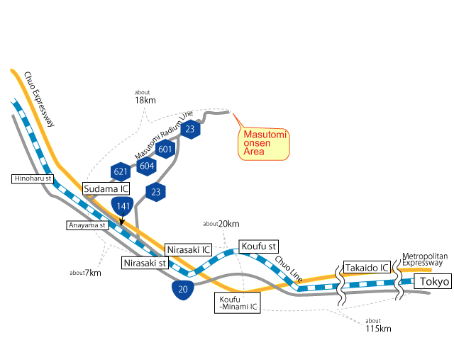 | 電車とバス; | 中央高速、調布インターから須玉インターへ 1時間45分、27号線、471号線、23号線に乗り換えて増冨温泉まで50分 |