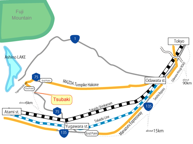 | 電車とタクシー; | 東京駅から東海道線で湯河原駅まで急行で1.5時間、または新宿から小田急線で小田原駅まで1時間10分、東海道線に乗り換え17分で湯河原駅に、現地までタクシーで7分 |